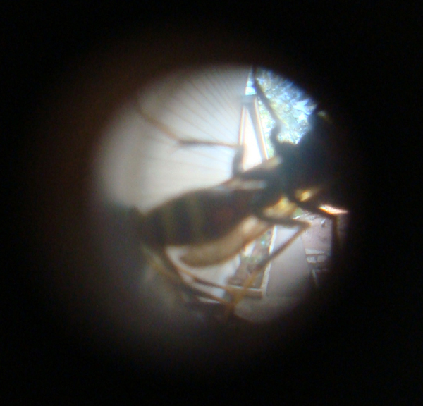 Monday when we got home, we see that a bunch of them have congregated on the peephole of the front double door, just a few inches from where the other door opens. Those bastards! What are they trying to do? Look inside at us? Here are some shots I took through the hole from the inside.